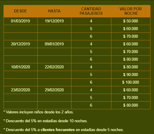 CABAÑAS MI FAMILIA > Valores Temporada 2019 - 2020